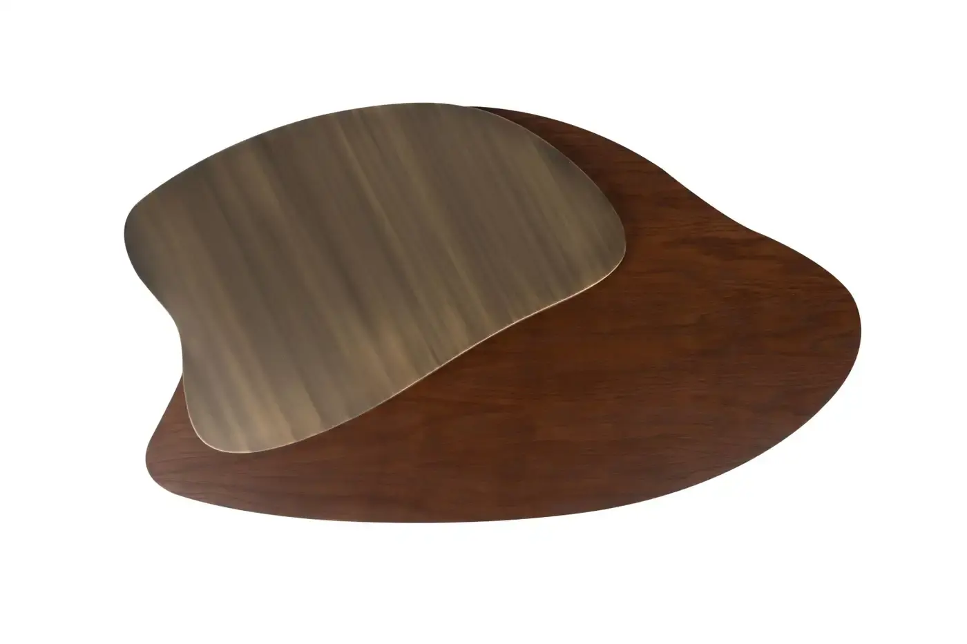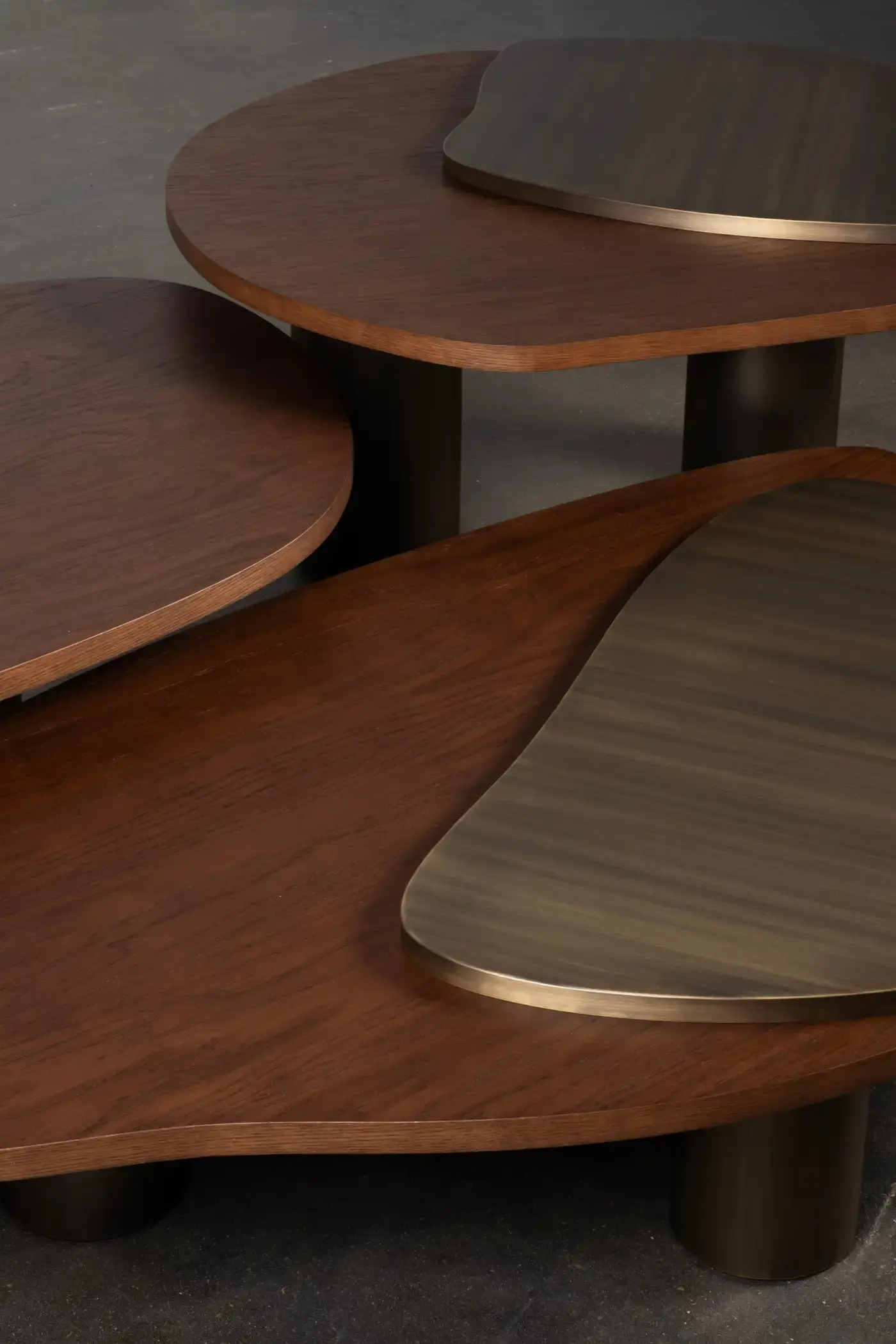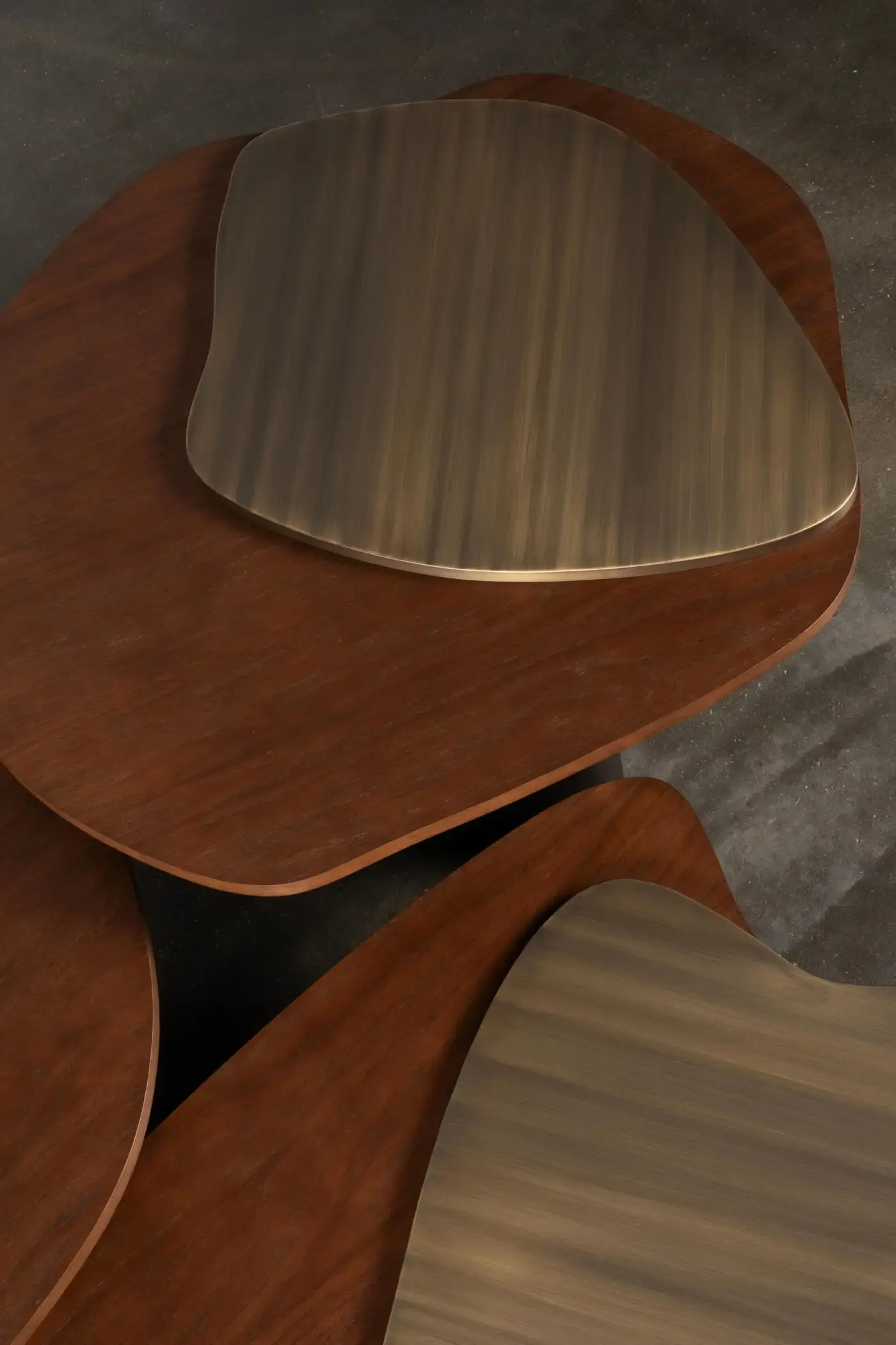 The Landscape coffee set consists of three coffee tables, each featuring a top and wooden semicircular legs veneered in natural walnut root with brown stain and a matte varnish. The veneer is anti-fungal and vermin-free.