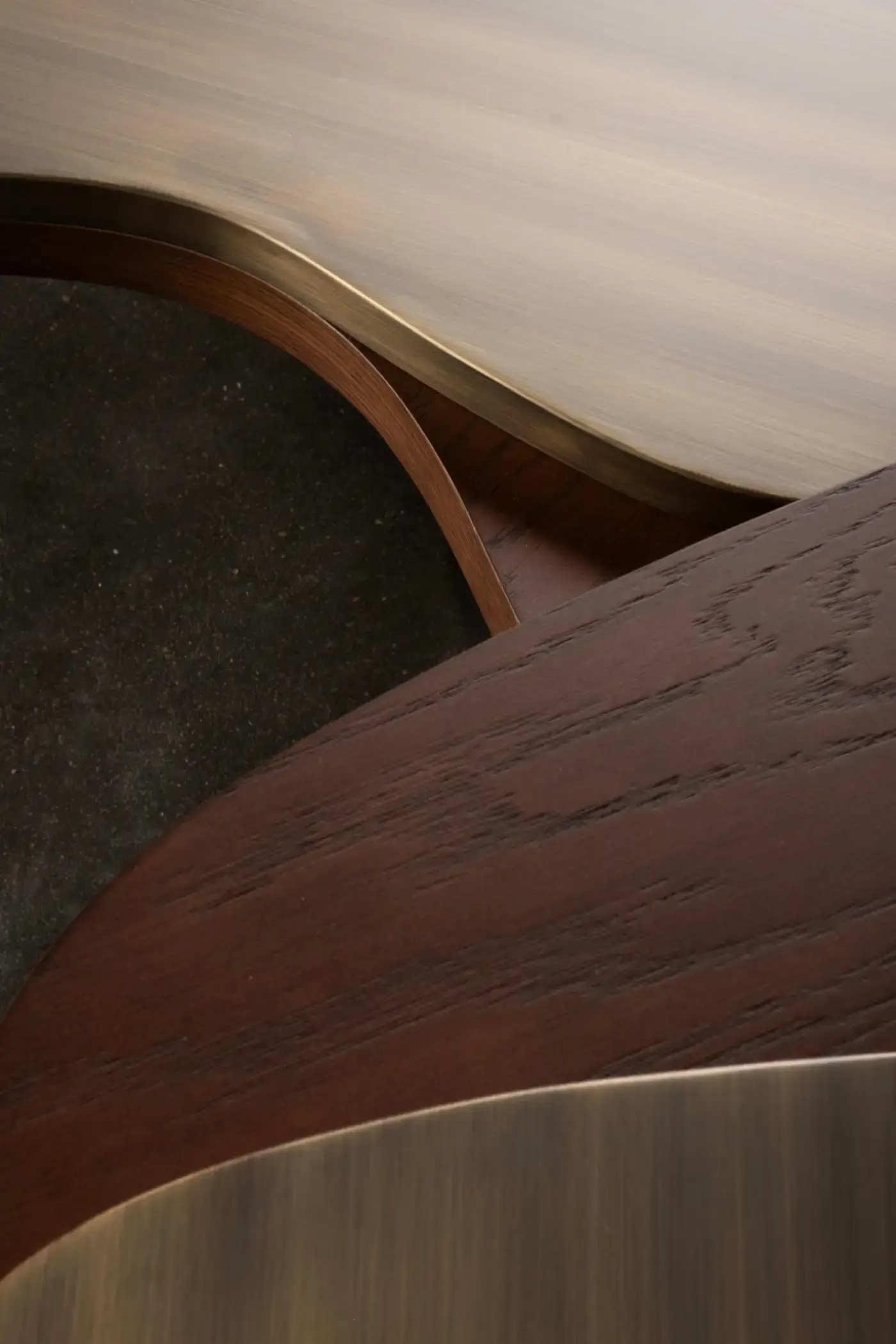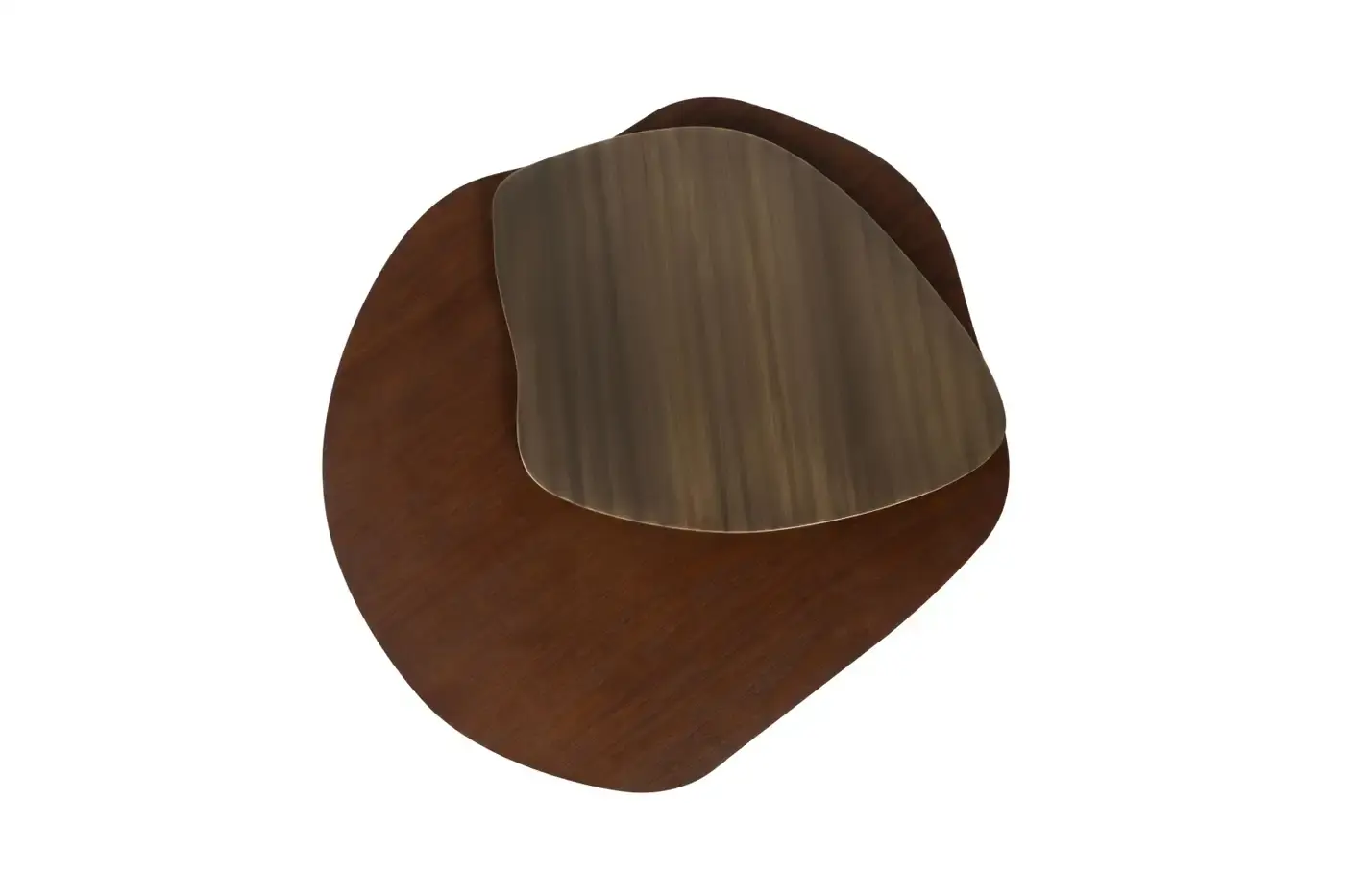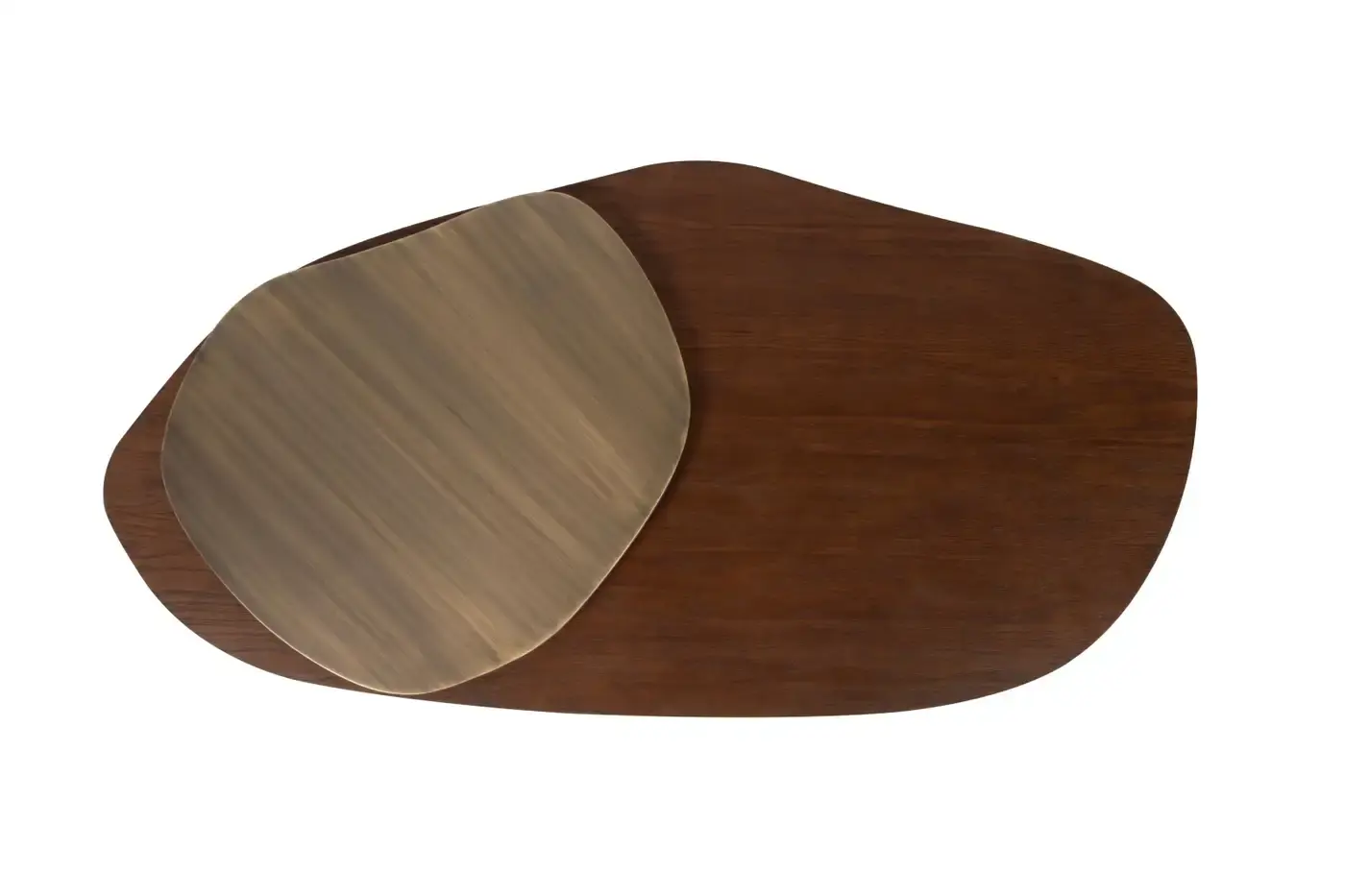 The Landscape coffee set consists of three coffee tables, each featuring a top and wooden semicircular legs veneered in natural walnut root with brown stain and a matte varnish. The veneer is anti-fungal and vermin-free.